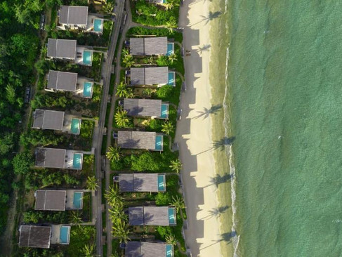 The villas line the curve of Dat Doc Beach like a contemporary fishing village — all pale timber, open air and private infinity pools facing an ocean that shifts from glassy turquoise to stormy blue. Mornings arrive slowly: bicycles on sandy paths, breakfast with your feet in the floorboards, the Lo Voi mountains rising behind you. There’s a sense that the island sets the tempo and the resort simply follows.
